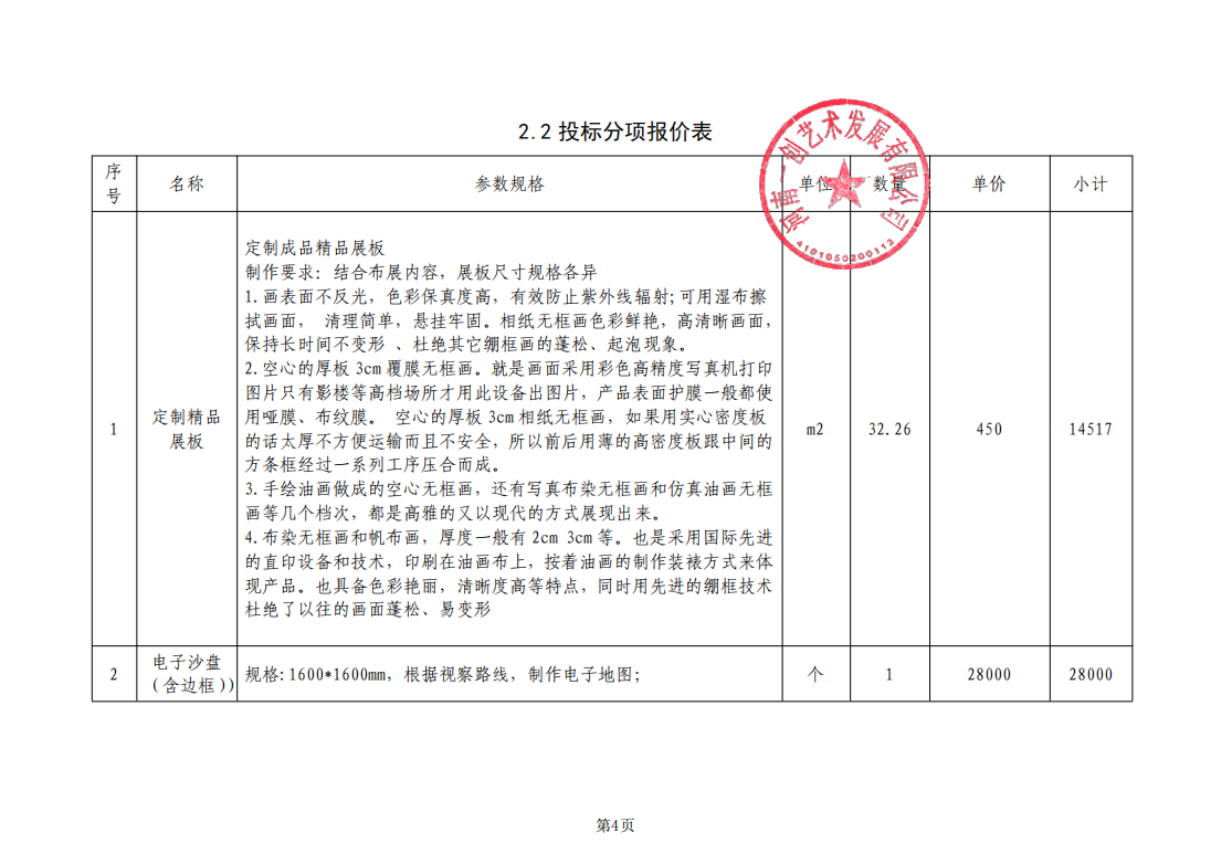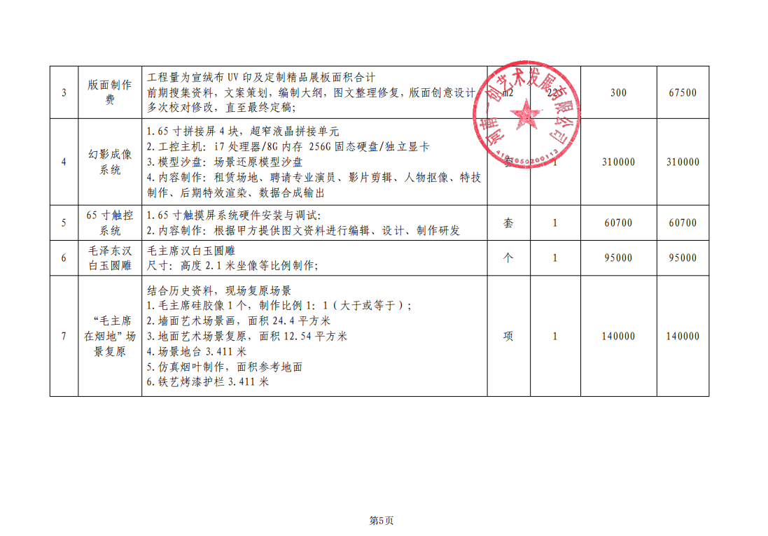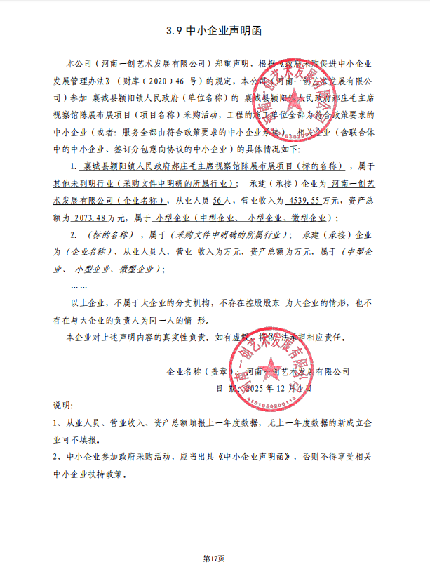 襄财磋商采购-2025-51襄城县颍阳镇人民政府郝庄毛主席视察馆陈展布展项目-成交公告 一、项目基本情况 1、采购项目编号:襄财磋商采购-2025-51 2、采购项目名称:襄城县颍阳镇人民政府郝庄毛主席视察馆陈展布展项目 3、采购方式:竞争性磋商 4、采购公告发布日期:2025年11月18日 5、评审日期:2025年12月01日 二、成交情况 包号 采购内容 供应商名称 地 址 中标金额 单位 备注信息 襄财磋商采购-2025-51-A 襄城县颍阳镇人民政府郝庄毛主席视察馆陈展布展项目 河南一创艺术发展有限公司 郑州市金水区经三北路32号2幢1单元17层 942,700.00 元 评审总得分:92分 序号 名称 品牌(如有) 规格型号 数量 单价 1 详见附件 详见附件 详见附件 详见附件 详见附件元 三、评审专家名单 王国平(组长,经济、技术专家)、魏建业(经济、技术专家)、姜宏伟(采购人代表,经济、技术专家) 四、代理服务收费标准及金额 收费标准:不收取 收费金额:0.00元 五、成交公告发布的媒介及成交公告期限 本次中标公告在《河南省政府采购网》、《许昌市政府采购网》、《全国公共资源交易平台(河南省·许昌市)》上发布,成交公告期限为1个工作日 。 六、其他补充事宜 供应商对成交结果提出质疑的,可以在成交公告期限届满之日起七个工作日内,使用CA数字证书登录《全国公共资源交易平台(河南省·许昌市)》,通过许昌公共资源交易系统一次性提出(质疑函内容按照财政部令第94号规定提供),逾期提交或未按照要求提交的质疑函将不予受理。质疑提出后投标人应及时联系招标公告中代理机构联系人查看。 七、凡对本次公告内容提出询问,请按以下方式联系 1. 采购人信息 名称:襄城县颍阳镇人民政府 地址:襄城县 联系人:张二现 联系方式:13782213999 2.采购代理机构信息(如有) 名称:襄城县政府采购中心 地址:襄城县八七路东段电子产业园12楼1204室 联系人:襄城县政府采购中心 联系方式:0374-3998026 3.项目联系方式 项目联系人:襄城县政府采购中心 联系方式:0374-3998026 附件 |